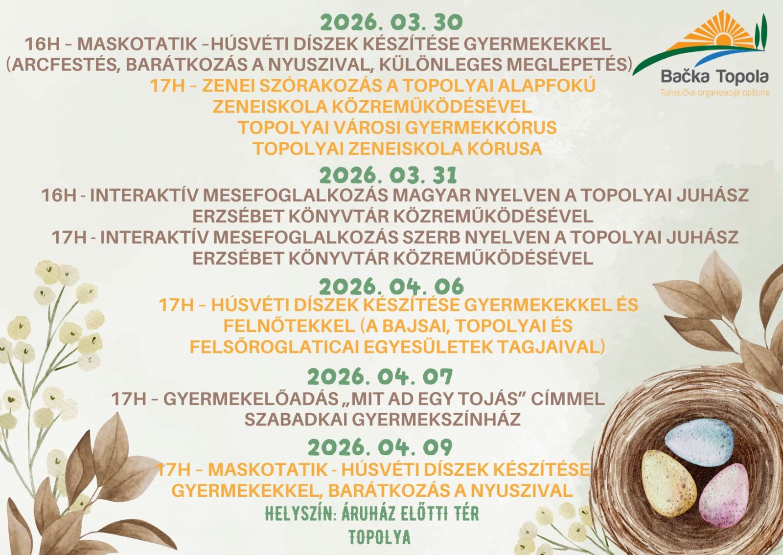 A Topolyai Községi Idegenforgalmi Szervezet szeretettel meghívja Önöket a húsvéti vásárra, amely tele lesz örömmel, színekkel és gazdag programokkal minden generáció számára!