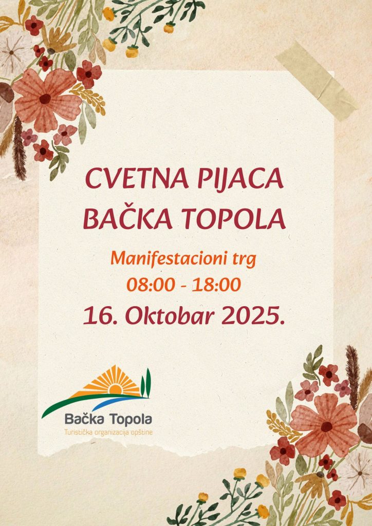 U četvrtak, 16. oktobra 2025. godine, na Manifestacionom trgu u Bačkoj Topoli od 08 do 18 časova održaće se tradicionalna Cvetna pijaca. Posetioci će imati priliku da uživaju u bogatoj ponudi cveća, sadnica, dekorativnih biljaka i prateće opreme, kao i da dobiju korisne savete od iskusnih proizvođača i izlagača. Dođite da obogatite svoj vrt, balkon ili dvorište i uživate u jesenjem šarenilu i mirisima prirode u samom srcu grada.
