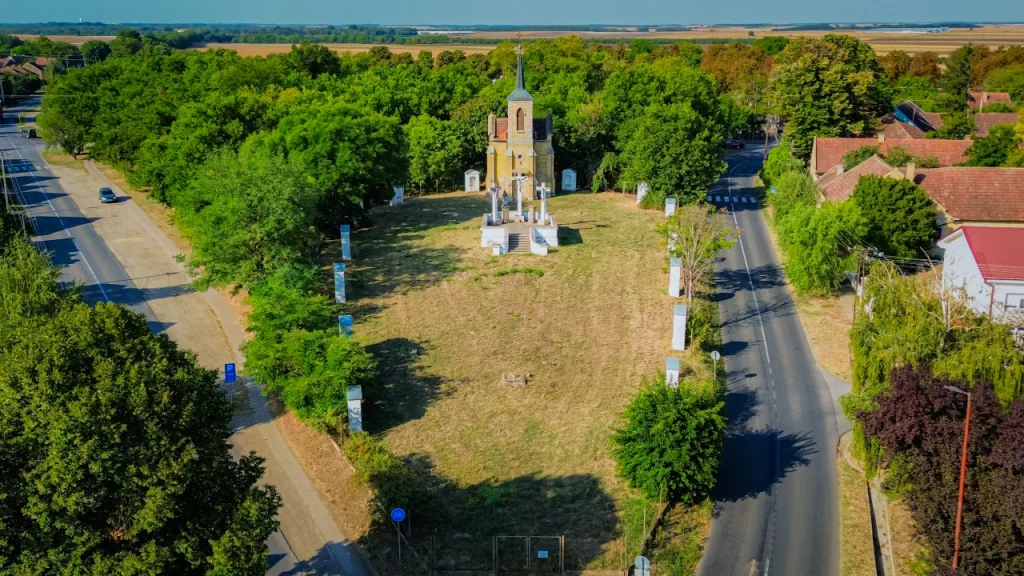 Zapadno od Topole, na raskršću puteva prema Staroj Moravici i Bajši, nalazi se Kalvarija, kapela sa skupinom kipova posvećenih novozavetnoj Golgoti, podignuta 1797. godine donacijom Pala Bakaija. Jedina sačuvana građevina iz 18-og veka i danas krasi najvišu tačku grada. Oko spomenika su 1878. godine izdgrađeni stubovi štacija, a 1898-e je podignuta kapela u neogotskom stilu, po nalogu vikara Karolja Bobiča i planovima građevinara Lajoša Fazekaša. Slike štacija napravio je slikar Jakobej Karolj. One su 1950-tih godina nestale, verovatno zbog njenih limenih osnova. Kompleks Kalvarija je više puta renoviran, najskorije 2013–2014-te godine.